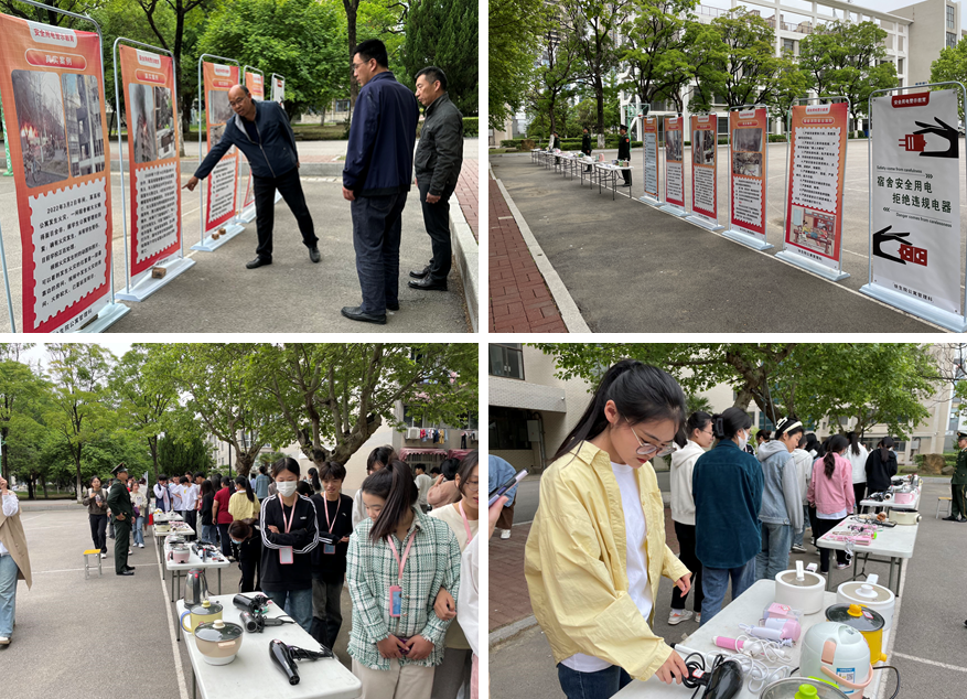 五、组织安全警示教育。在三号公寓楼前举办“违章电器警示教育”活动,通过制作宣传展板、收集典型案例、重申公寓管理规定、展览违禁电器等形式,提醒同学们用电防火安全的重要性。活动现场,被查处的违章电器按类别分桌展示,包括电水壶、电吹风机、电卷发棒、电饭煲等。通过展览,教育提醒同学们自觉遵守学校各项管理规定,拒绝使用违章电器,为共建平安公寓贡献自己的一份力量。