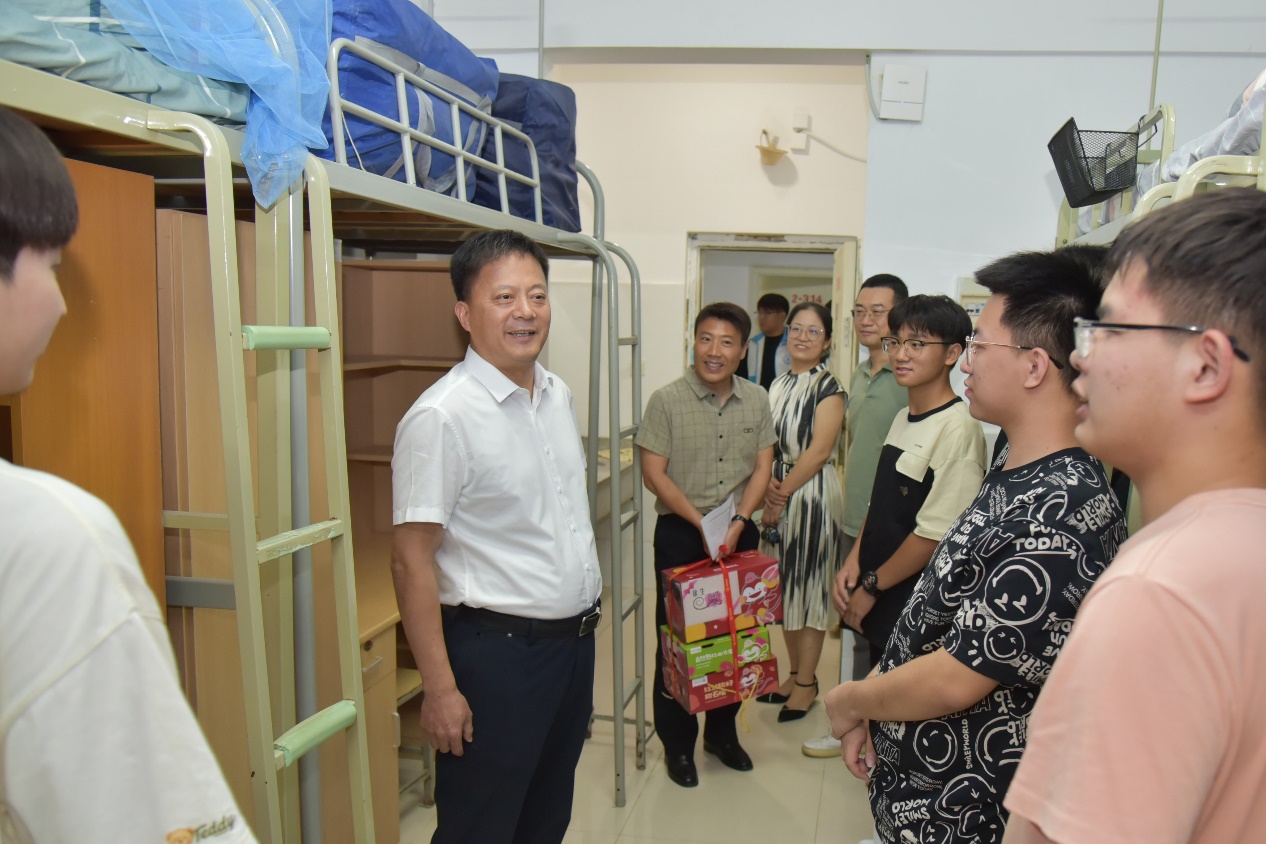 9月17日,党委书记徐锋,校长张军、党委副书记谭红玲、副校长强承魁、纪委书记刘颖带领学工处及七个二级学院的负责人,分别前往大学生公寓看望慰问新同学,并为当天过生日的七名新同学送上生日祝福和生日蛋糕。