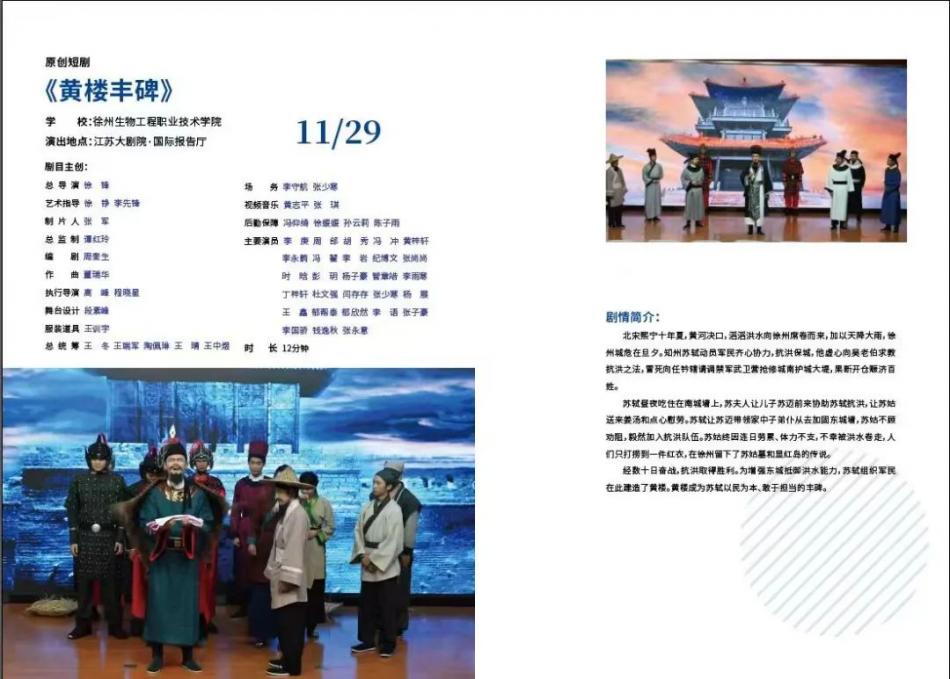 我校大力推进“治人文、精技术”教育教学改革,将中华优秀传统文化教育融入人才培养、科学研究、社会服务、文化传承等办学过程中,推进落实“时代新人铸魂工程”,努力培养具有深厚文化底蕴和专业技能的高素质技术技能人才。学校践行“两个结合”、引导学生学习苏轼“以民为本,敢于担当”的精神,自编自导自演了以苏轼任徐州知州期间抗洪为题材的《黄楼丰碑》短剧,荣获省委宣传部和省教育厅联合举办的2024年江苏省大学生戏剧展演二等奖;首次承办“江苏方志大讲堂暨徐州方志大讲堂”,两位教师参与江苏文脉整理与研究工程项目成果《江苏地方文化史·徐州卷》编撰;在省教育厅、省文化和旅游厅联合举办的2024年度中华经典诵读大赛中,获教师组特等奖。