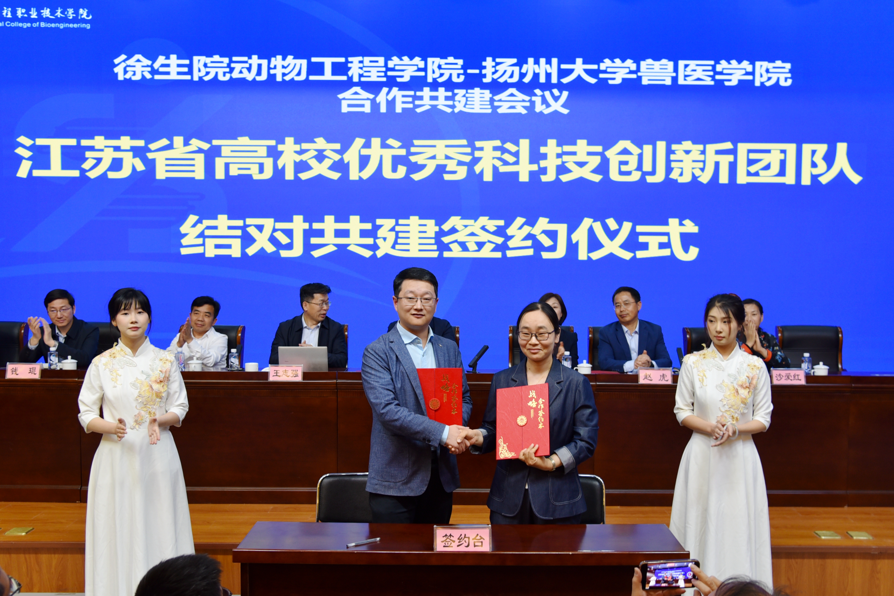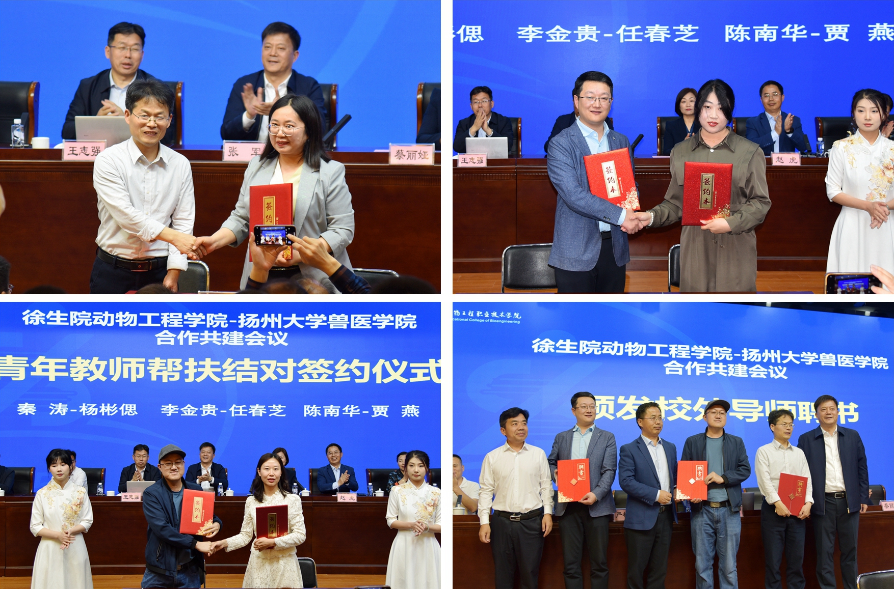 王志强、孙朋分别介绍了各自学院的事业发展情况。双方学院代表共同签订了徐州生物工程职业技术学院动物工程学院-扬州大学兽医学院战略合作协议、江苏省高校优秀科技创新团队共建协议、江苏省样板党支部结对共建协议和青年教师帮扶结对协议。张军、赵虎、严树超为扬大兽医学院秦涛、李金贵、陈南华三位专家颁发了校外导师聘书。